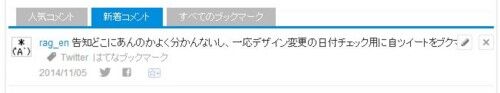 他の人にはどう見えてるのか分かんないですけど、自分のトコだとこんな感じ。 とりあえず、 id、コメント、タグ、コメント単体ページリンク、日時…の順番になっとるのか。謎マイナーチェンジで違和感すげぇのもアレだけど、それよりまず自コメントの単体ペー…